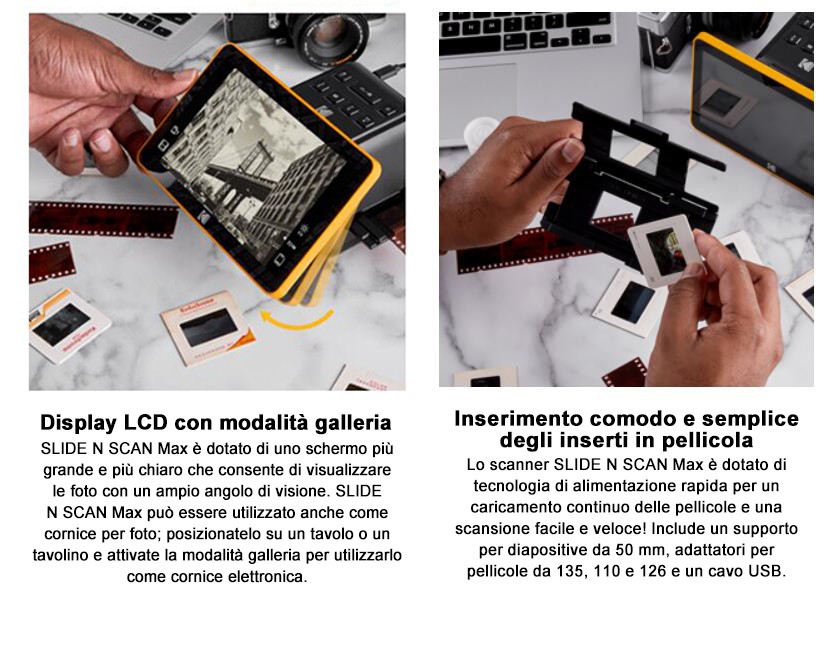 KODAK SLIDE N SCAN Max produce immagini nitide e bilanciate. È la risoluzione ideale per negativi e diapositive a colori o in bianco e nero.